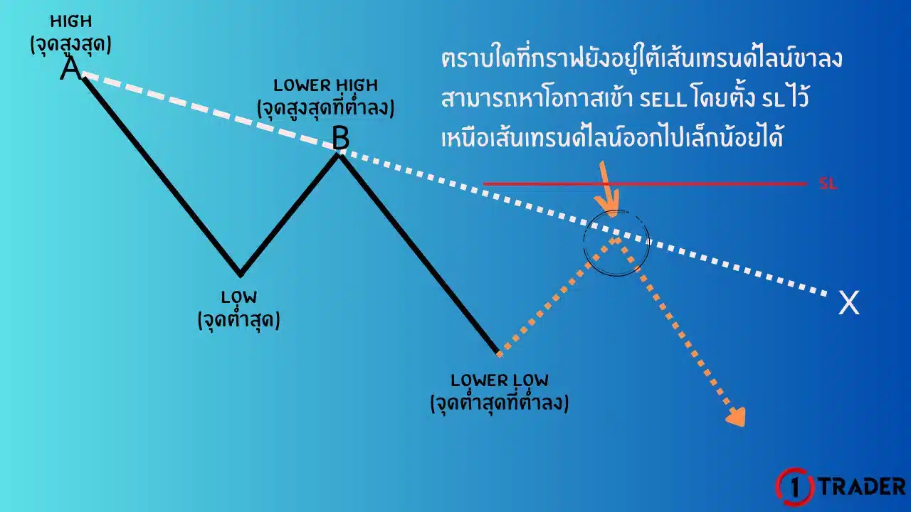 เช่นเดียวกันกับเทรนด์ขาขึ้น เมื่อดูกราฟในปัจจุบันแล้วพบว่ากราฟอยู่ในเทรนด์ขาลงเราจะสามารถหาโอกาสเข้า SELL ตามเทรนด์ขาลงได้ด้วยการใช้ “เทรนด์ไลน์” เข้ามาช่วย โดยตีจากจุดสูงสุดของเทรนด์ชุดนั้น (จุด A ในภาพด้านบน) ไปเชื่อมกับจุดสูงสุดที่ต่ำลง (จุด B ในภาพด้านบน) จะทำให้ได้เส้นเทรนด์ไลน์ X ยืดยาวออกไปทางด้านขวา (เส้นประสีขาว)