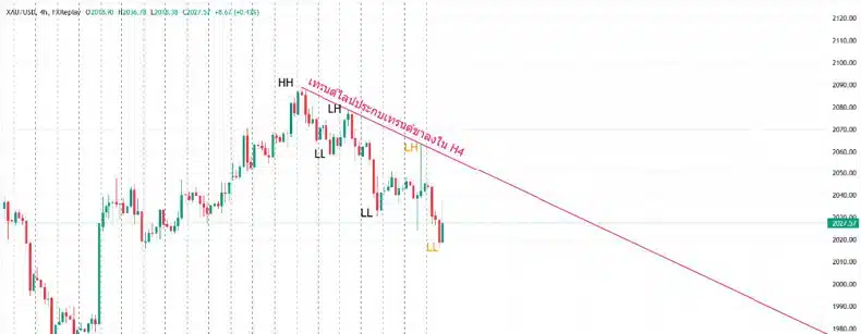 จากภาพด้านบนจะสังเกตว่ากราฟในขณะนั้นมีเทรนด์ปัจจุบันเป็นเทรนด์ขาลง เพราะเข้าเงื่อนไขครบทั้งสองข้อของเทรนด์ขาลงคือ High ลด Low ลด ดังนั้นเราจึงสามารถตีเส้นเทรนด์ไลน์ขาลงได้โดยตีจากจุด High แรกสุดซึ่งเป็นต้นเทรนด์ไปเชื่อมกับ High ที่ต่ำลง ทำให้ได้เทรนด์ไลน์ขาลงขึ้นมาหนึ่งเส้น (เส้นสีแดงในภาพด้านบน) ตราบใดที่กราฟยังอยู่ใต้เส้นเทรนด์ไลน์ขาลงนี้เราจะสามารถหาโอกาสเข้าคำสั่ง SELL ตามเทรนด์ได้ โดยตั้ง SL อยู่เหนือเส้นเทรนด์ไลน์ออกไปเล็กน้อย และมีเป้าทำกำไรหรือ TP ที่บริเวณจุดต่ำสุดใหม่