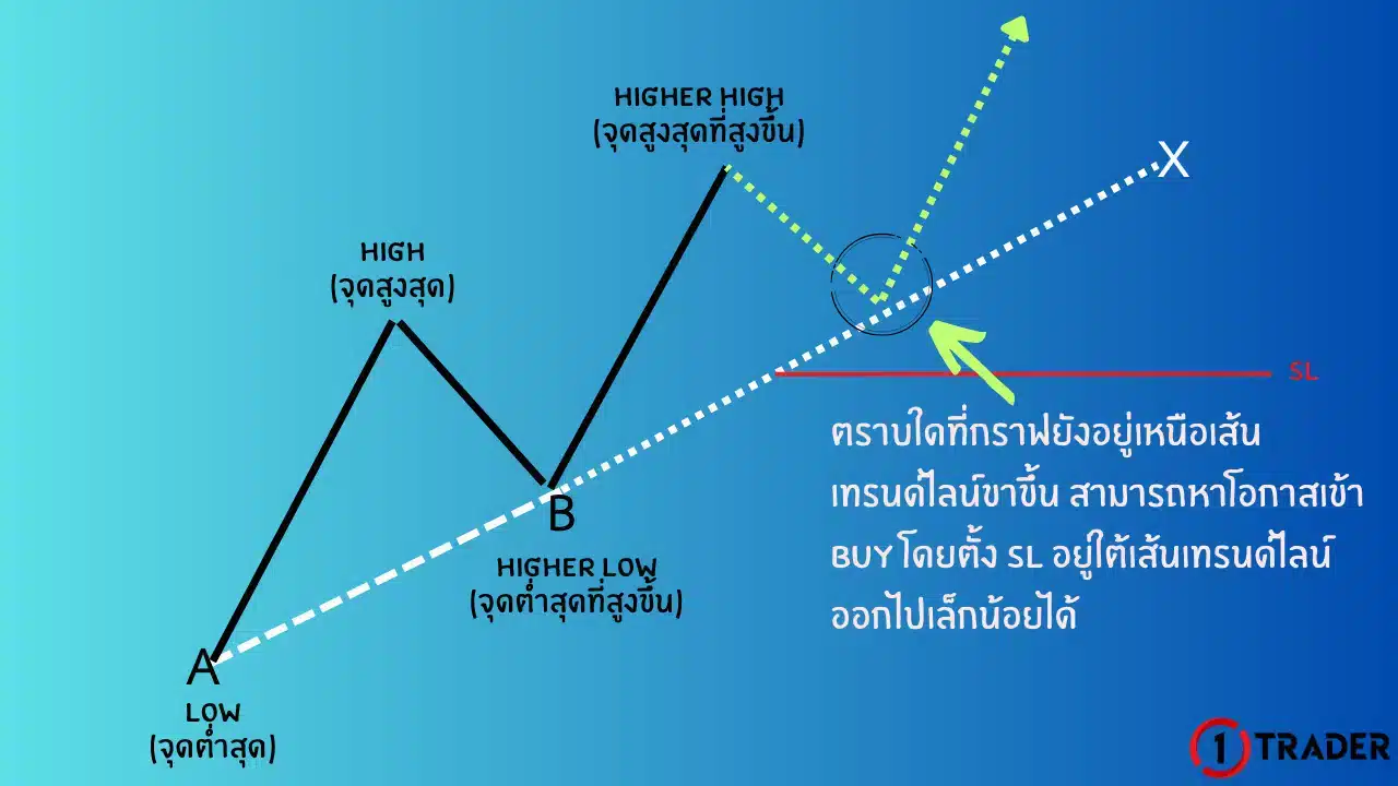 เมื่อดูกราฟในปัจจุบันแล้วพบว่ากราฟอยู่ในเทรนด์ขาขึ้นเราจะสามารถหาโอกาสเข้า BUY ตามเทรนด์ขาขึ้นได้ด้วยการใช้เครื่องมือพื้นฐานที่เรียกว่า “เทรนด์ไลน์” เข้ามาช่วย โดยตีจากจุดต่ำสุดของเทรนด์ชุดนั้น (จุด A ในภาพด้านล่าง) ไปเชื่อมกับจุดต่ำสุดที่สูงขึ้น (จุด B ในภาพด้านล่าง) จะทำให้ได้เส้นเทรนด์ไลน์ X ยืดยาวออกไปทางด้านขวา (เส้นประสีขาว)